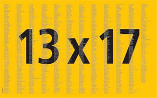 13×17 è un’operazione trasversale: l’elenco dei partecipanti, ad oggi circa 1200, comprende nomi internazionalmente noti e altri assolutamente oscuri nel panorama attuale delle arti visive; nell’insieme lo spaccato rappresentato dalla lista documenta in senso oggettivo - anche se ovviamente non esauriente - la situazione delle arti visive attuali nel nostro paese.