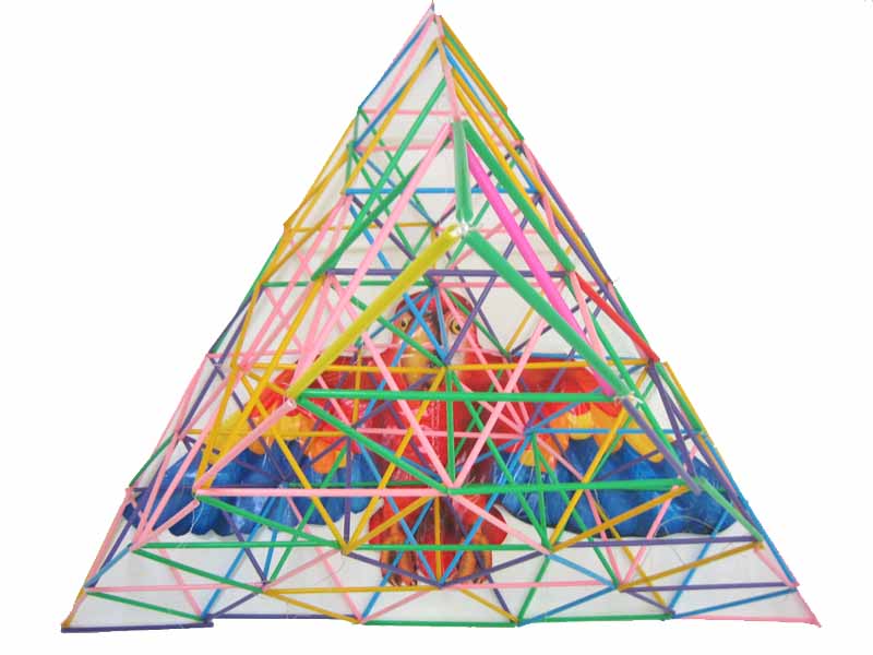 Si tratta di una costruzione sul concetto delle “travature reticolari”, autoportante, basata sull’aggregazione di moduli geometrici (in questo caso il tetraedro), e realizzata con circa 20.000 cannucce alimentari e filo di cotone. Ogni modulo è costituito da sei elementi; l’aggregazione di quattro moduli da luogo ad una piramide più grande e così via. La modularità dell’elemento permette di costruire quasi all’infinito l’installazione.La dimensione finale sarà in questo caso una grande piramide di metri 6.60 per ogni lato. La leggerissima struttura, sospesa in aria per mezzo di un filo di naylon darà l’impressione di volare. Tre elementi tipo piccole vele ai tre angoli di base permetteranno all’aria di muovere la struttura interaggendo visivamente con il luogo dove è posizionata.